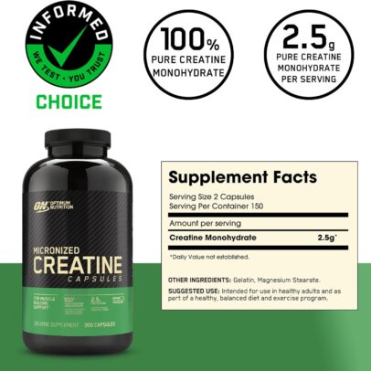 Optimum Nutrition Micronized Creatine Monohydrate Capsules, Keto Friendly, 2500mg, 300 Capsules (Packaging May Vary)