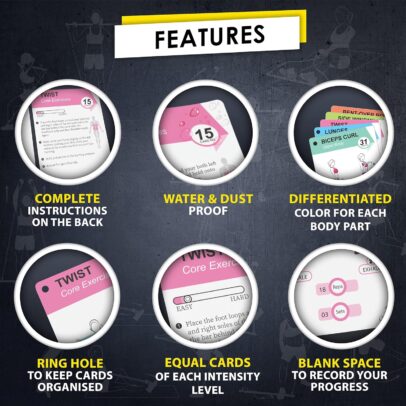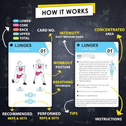User Friendly – The Deck includes 5 distinct color cards, representing workout of each body part. Every Card illustrates the focused muscles & also indicates the intensity level from easy to hard making it ideal for a beginner to an expert.