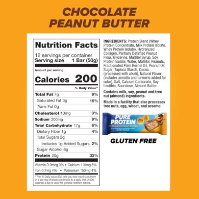 Pure Protein Chocolate Peanut Butter Protein Bars are delicious high protein snacks with high quality protein that support lean muscle and strength. These peanut butter chocolate protein bars contain whey protein isolate and are gluten free. Each protein bar contains 20 grams of protein, 200 calories and 2 grams of sugar to support your busy and active lifestyle. Grab a Pure Protein bar for high quality protein, an essential part of a nutritious, balanced diet. With classic chocolate peanut butter flavor, these high protein bars are a treat any time of day. Whether you prefer to enjoy peanut butter protein bars pre workout, post workout, or on the go, you’ll love the peanut butter taste in these gluten free protein bars. Pure Protein is proud to offer high protein snack bars with low sugar and great taste.