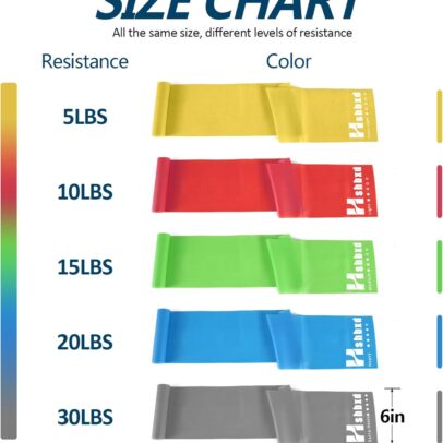 5 Levels Of Resistance – 5 resistance bands are 59in (150cm) long and 5.9in (15cm) wide, the resistance bands is yellow band (5 lbs), red band (10 lbs), green band (15 lbs), blue strap (20 lbs), gray strap (30 lbs).