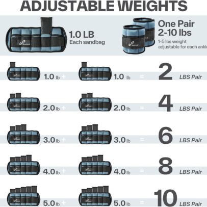 ADJUSTABLE LEG WEIGHTS: The sandbags for ankle weights are removable. Each single weight comes with 5 removable sandbags which weighs 1 LB. Each single weight can be adjusted from 1 to 5 lbs and one pair weights can be adjusted from 2 to 10 lbs by adding or reducing the sandbags.
