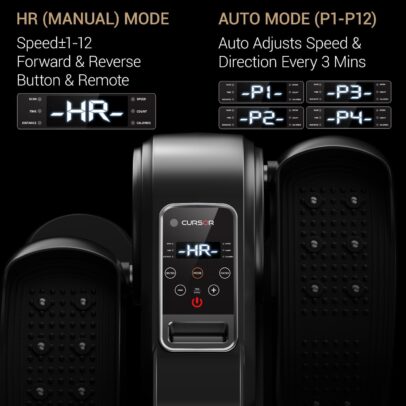 HR & Auto Mode: Exercise anytime, anywhere. In HR(Manual) mode, you can adjust workout time(15-30min), speed(1-12) and direction (forward&reverse) by remote control or button of the elliptical machine. Then switch “mode” to Auto mode that the speed and direction have been programmed. In auto mode, you can adjust P1-P12 mode by press mode button, the speed of the mini seated elliptical changes every minute, and the direction changes every 3 minutes